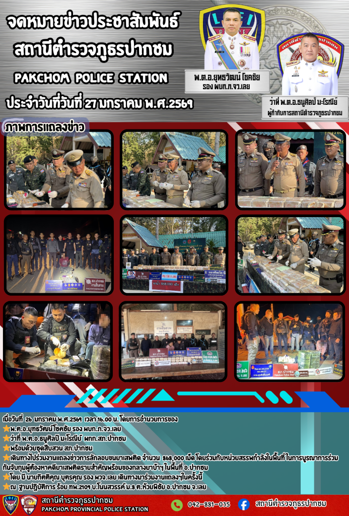 ⭐เดินทางไปร่วมงานแถลงข่าวการลักลอบขนยาเสพติด จำนวน 868,000 เม็ด โดยร่วมกับหน่วยสรรพกำลังในพื้นที่ ในการบูรณาการร่วมกันจับกุมผู้ต้องหาคดียาเสพติดรายสำคัญพร้อมของกลางยาบ้าฯ ในพื้นที่ อ.ปากชม