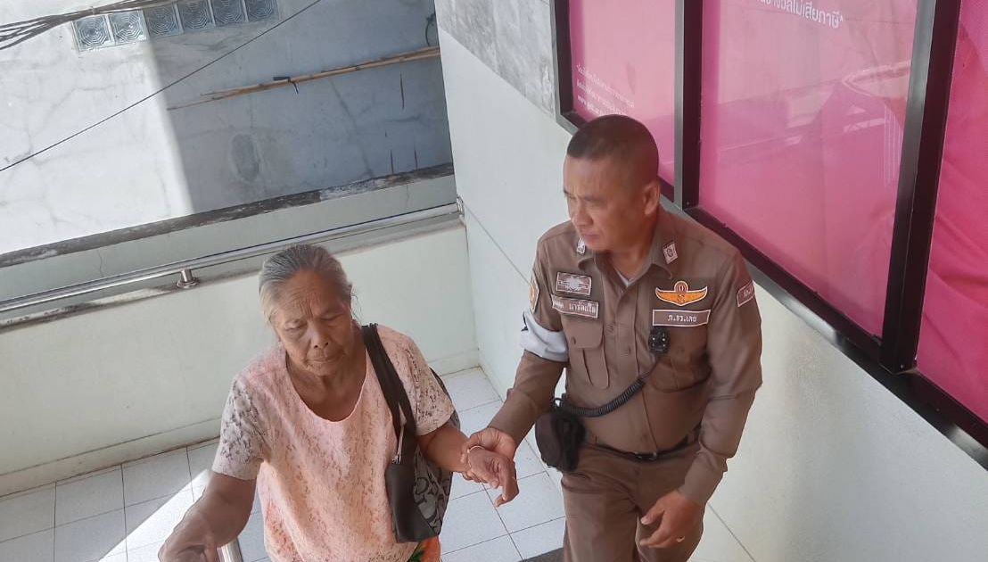 ช่วยเหลือประชาชนผู้สูงอายุเดินขึ้นบันได ที่มาใช้บริการธนาคารออมสิน