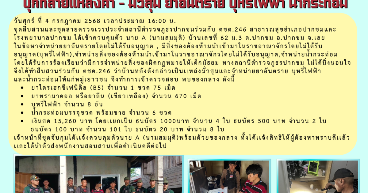โดยได้รับการร้องเรียนว่ามีการจำหน่ายสิ่งของผิดกฏหมายให้เด็กมัธยม ทางสถานีตำรวจภูธรปากชม ไม่ได้นิ่งนอนใจ จึงได้ทำสืบสวนร่วมกับ ตชด.246 ว่าบ้านหลังดังกล่าวเป็นเเหล่งมั่วสุมและจำหน่ายยาอันตราย บุหรี่ไฟฟ้า