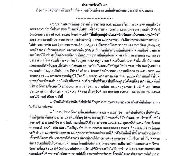 ประกาศจังหวัดเลย… ห้าม!! เผาในที่โล่งทุกชนิดโดยเด็ดขาด!! ตั้งแต่วันที่ 22 มกราคม – 31 พฤษภาคม 2568 หากฝ่าฝืนให้มีการบังคับใช้มาตรการทางกฏหมายต่อผู้กระทำผิดอย่างเคร่งครัด
