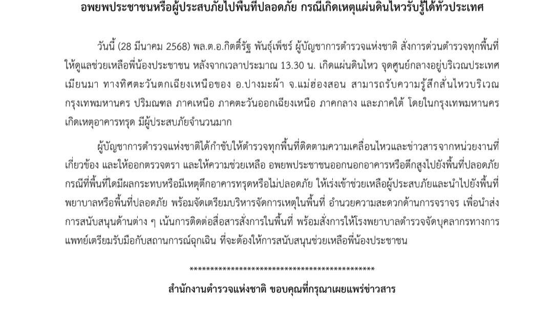 ประชาสัมพันธ์แผ่นดินไหว 28 มีนาคม 2568 โดย pakchom814 / ข่าวประชาสัมพันธ์,ข่าวภารกิจผู้บังคับบัญชา Facebook iconFacebookTwitter iconTwitterLINE iconLine