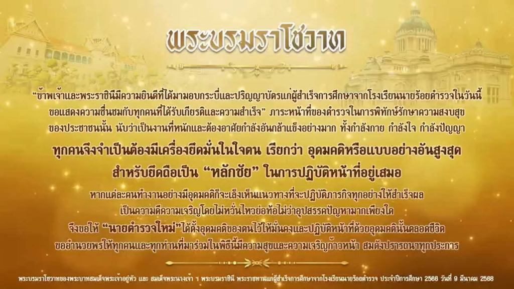 ผบ.ตร. ได้อัญเชิญพระบรมราโชวาทของพระบาทสมเด็จพระเจ้าอยู่หัว พระราชทานให้แก่ผู้สำเร็จการศึกษาจากโรงเรียนนายร้อยตำรวจ ประจำปีการศึกษา 2566 (นรต.รุ่นที่ 77) วันที่ 9 มีนาคม 2568 เพื่อให้ข้าราชการตำรวจทุกนายได้น้อมนำมายึดถือเป็นหลักอุดมคติในการทำงาน และให้ผู้บังคับบัญชาไปถ่ายทอดและปลูกฝัง พร้อมทั้งได้กำชับการปรับแนวความคิด (Mindset) เกี่ยวกับภารกิจ การปกป้อง พิทักษ์ เทิดทูน สถาบันชาติ ศาสนา พระมหากษัตริย์ การดูแลผู้ใต้บังคับบัญชาในด้านสวัสดิการ ให้ความช่วยเหลือ บรรเทาเหตุเดือดร้อนต่าง ๆ ต้องแก้ไขในสิ่งที่ผิดและกล้าทำในสิ่งที่ถูกต้อง เหมาะสม ตำรวจเป็นผู้รักษากฎหมายต้องไม่กระทำผิดเสียเอง ยึดมั่นในอุดมคติตำรวจ ผู้บังคับบัญชาต้องเป็นต้นแบบและเป็นแบบอย่างที่ดี ยกย่อง เชิดชูเกียรติผู้ที่ประพฤติดีประพฤติชอบ ตำรวจต้องช่วยเหลือประชาชน พัฒนา ดูแลความเป็นอยู่ของประชาชน เพราะอยู่ในพื้นที่ มีความใกล้ชิดกับประชาชน ต้องรับฟังและทำความเข้าใจในความเดือดร้อนของประชาชน นำมาประสานงานช่วยเหลือ แก้ไขปัญหาต่อไป