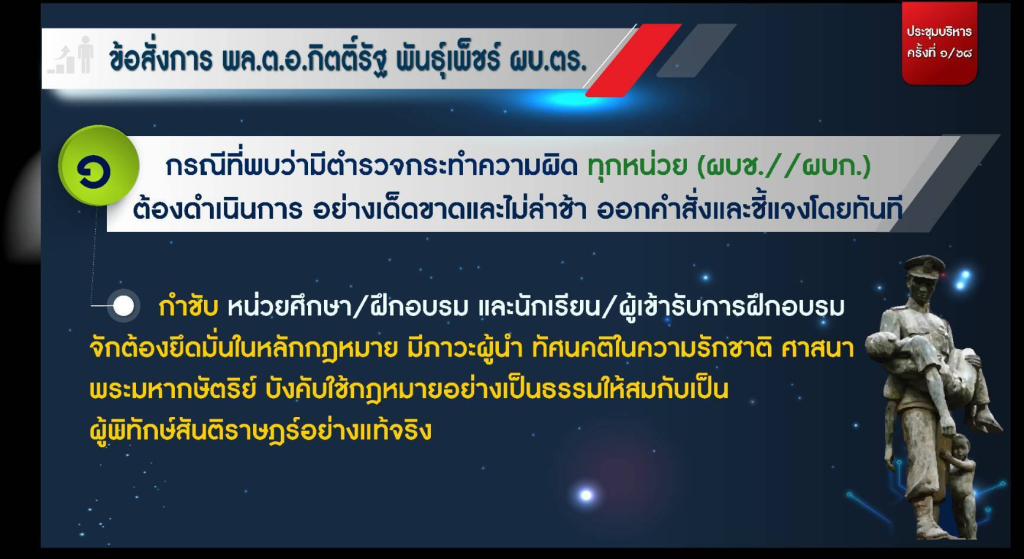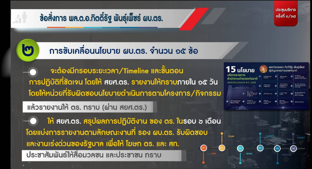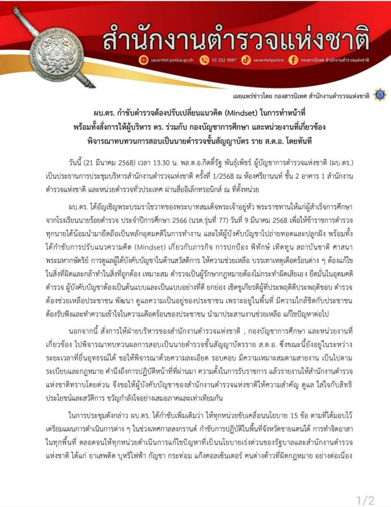 วันนี้ (21 มีนาคม 2568) เวลา 13.30 น. พล.ต.อ.กิตติ์รัฐ พันธุ์เพ็ชร์ ผู้บัญชาการตำรวจแห่งชาติ (ผบ.ตร.) เป็นประธานการประชุมบริหารสำนักงานตำรวจแห่งชาติ ครั้งที่ 1/2568 ณ ห้องศรียานนท์ ชั้น 2 อาคาร 1 สำนักงานตำรวจแห่งชาติ และหน่วยตำรวจทั่วประเทศ ผ่านสื่ออิเล็กทรอนิกส์ ณ ที่ตั้งหน่วย
