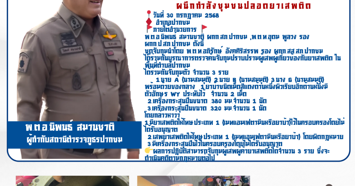 ชุดจับกุมนำโดย พ.ต.ท.อภิรักษ์ อังคศิริสรรพ รอง ผกก.สส.สภ.ปากชม และชุดสืบสวนสถานีตำรวจภูธรปากชม ได้ร่วมกันบูรณาการตรวจค้นจับกุมปราบปรามผู้เสพผู้เกี่ยวข้องกับยาเสพติด ในพื้นที่ตำบลปากชม