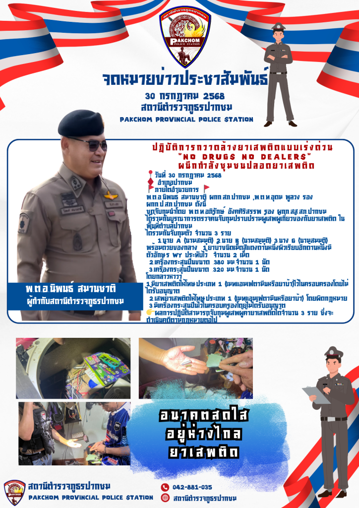 ผลการปฏิบัติสามารถจับกุมผู้เสพผู้ค้ายาเสพติดได้จำนวน 3 ราย ซึ่งจะดำเนินคดีตามกฎหมายต่อไป