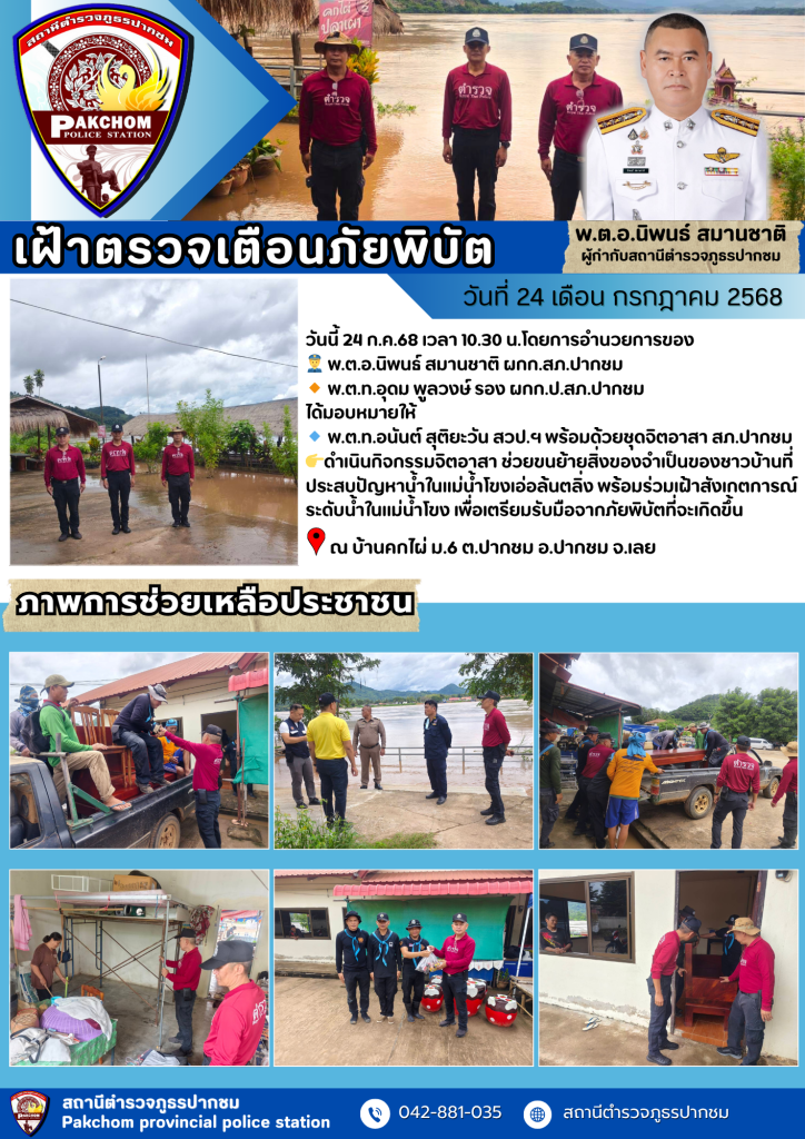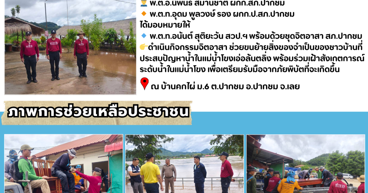 ดำเนินกิจกรรมจิตอาสา ช่วยขนย้ายสิ่งของจำเป็นของชาวบ้านที่ประสบปัญหาน้ำในเเม่น้ำโขงเอ่อล้นตลิ่ง พร้อมร่วมเฝ้าสังเกตการณ์ระดับน้ำในเเม่น้ำโขง เพื่อเตรียมรับมือจากภัยพิบัตที่จะเกิดขึ้น