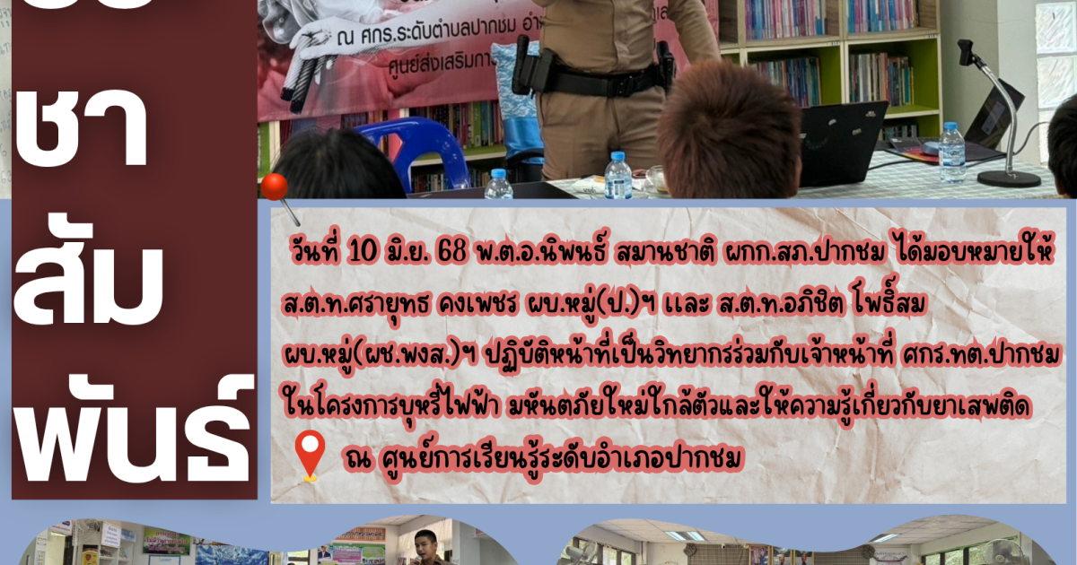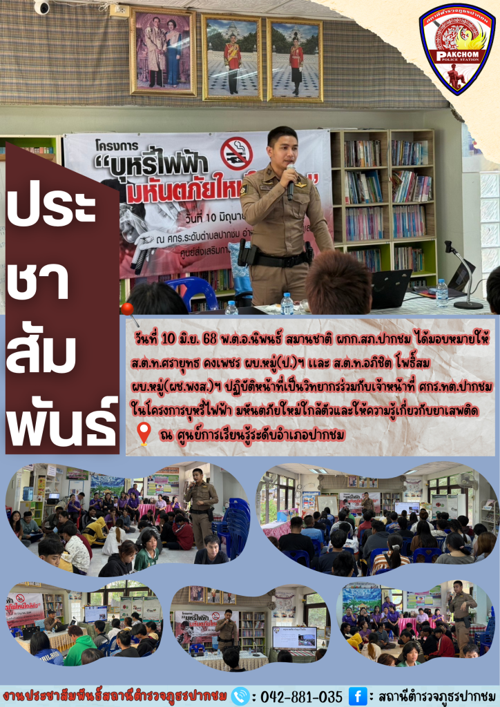 ส.ต.ท.อภิชิต โพธิ์สม ผบ.หมู่(ผช.พงส.)ฯ ปฏิบัติหน้าที่เป็นวิทยากรร่วมกับเจ้าหน้าที่ ศกร.ทต.ปากชม ในโครงการบุหรี่ไฟฟ้า มหันตภัยใหม่ใกล้ตัวและให้ความรู้เกี่ยวกับยาเสพติด