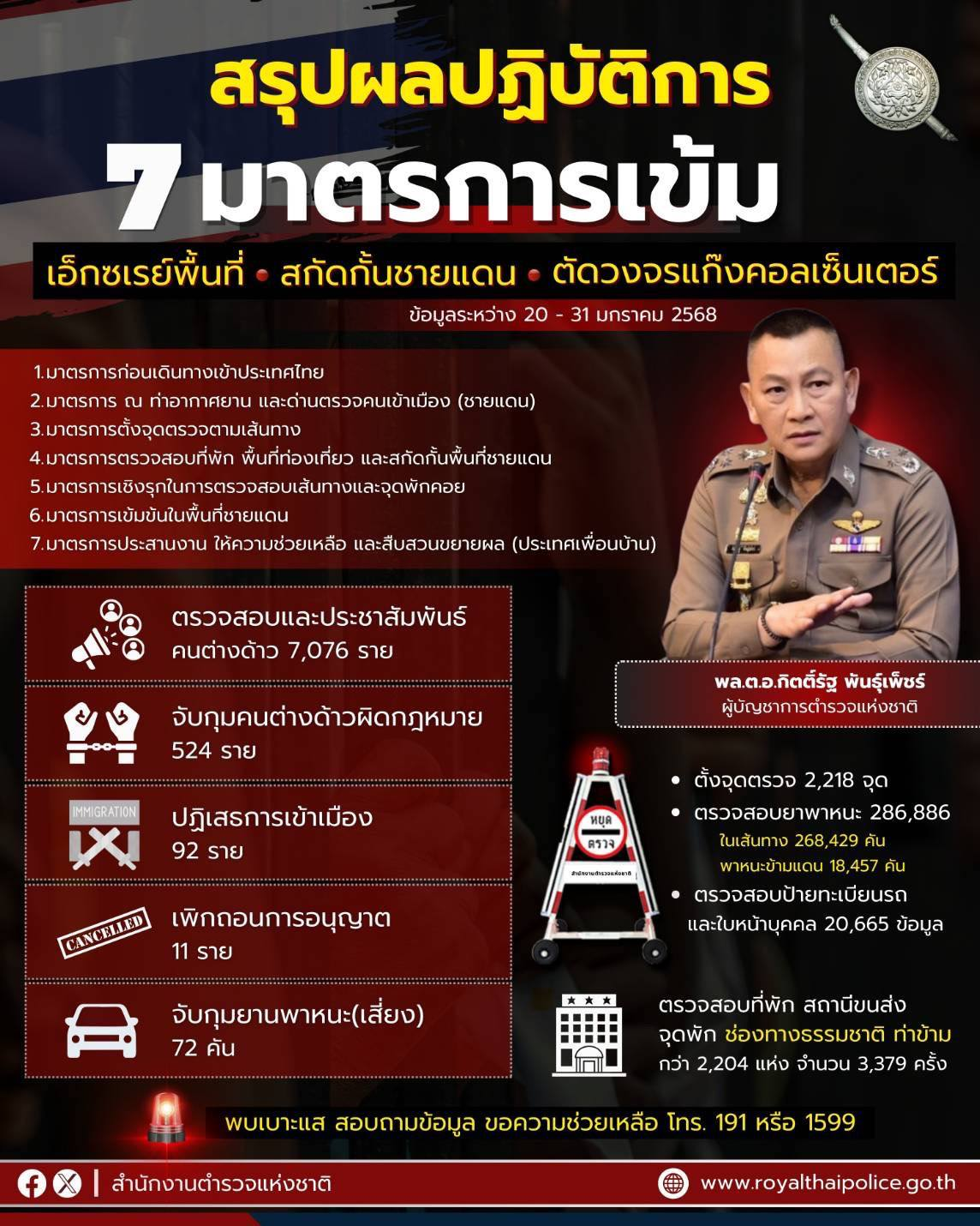 ผู้บัญชาการตำรวจแห่งชาติ สรุปผลการปฏิบัติ 7 มาตรการเข้มข้น หลังขีดเส้นตาย 7 วัน ปฏิบัติการเชิงรุกตั้งแต่ก่อนเข้าประเทศ เอ็กซเรย์ทุกพื้นที่ สกัดกั้นชายแดน ปรับแผนรองรับ