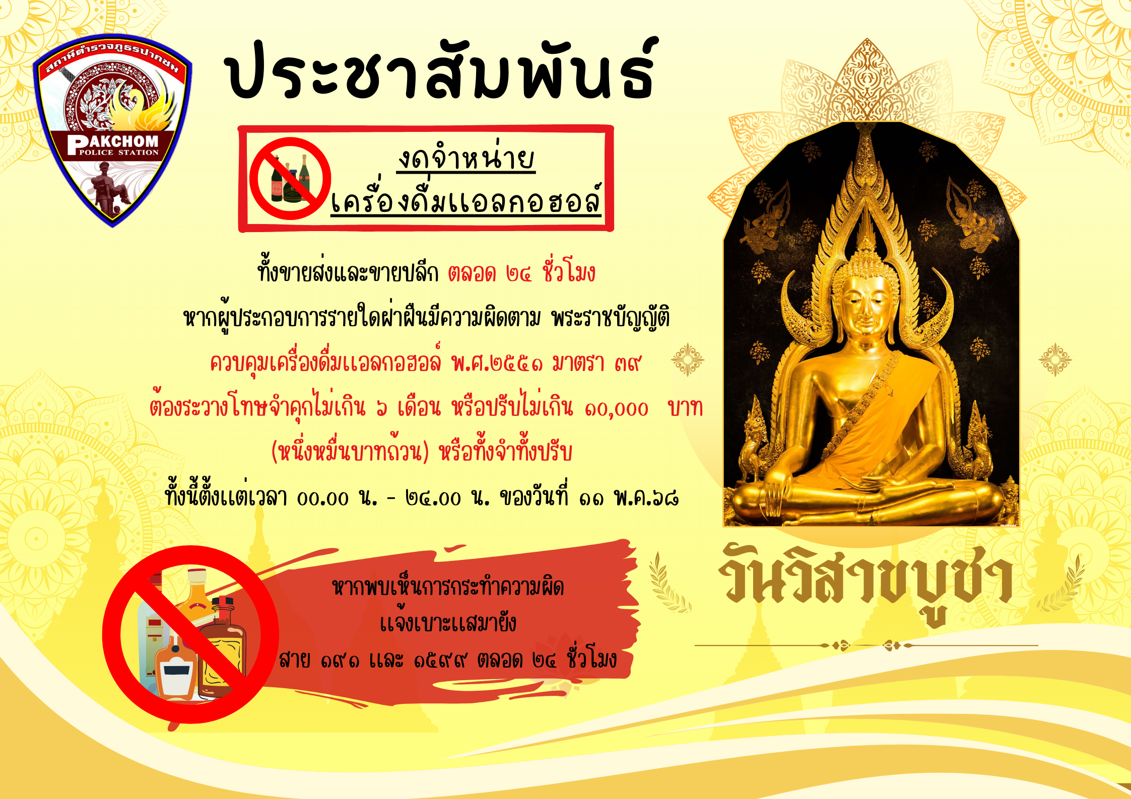 ประชาสัมพันธ์งดจำหน่ายเครื่องดื่มแอลกอฮอล์ทุกชนิด ตั้งแต่เวลา 00.01น.-24.00น.ของวันที่11 พ.ค 68 เนื่องในวันวิสาขบูชา 10 พฤษภาคม 2568 โดย pakchom814