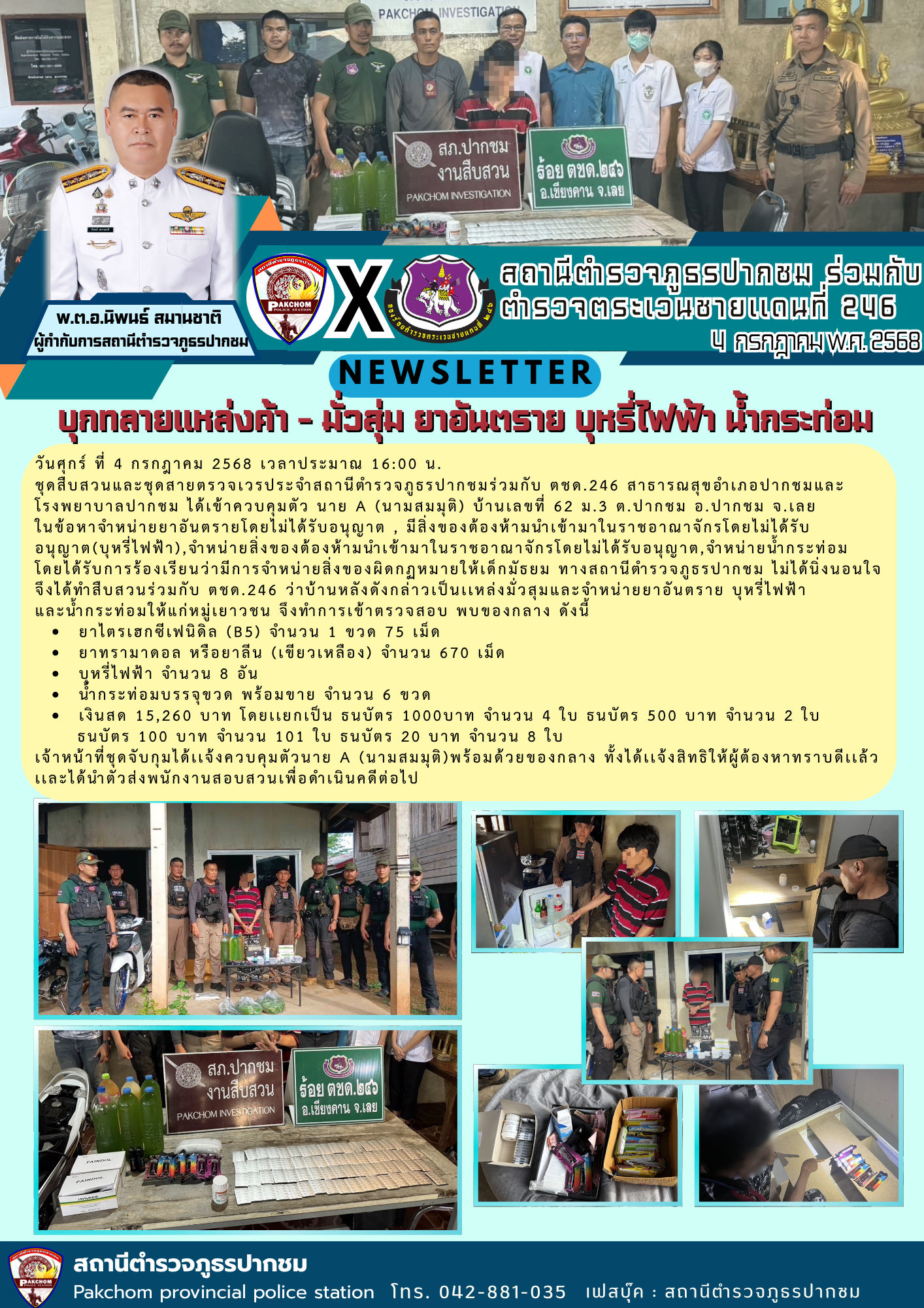 วันศุกร์ ที่ 4 กรกฎาคม 2568 เวลาประมาณ 16:00 น. ชุดสืบสวนและชุดสายตรวจเวรประจำสถานีตำรวจภูธรปากชมร่ว